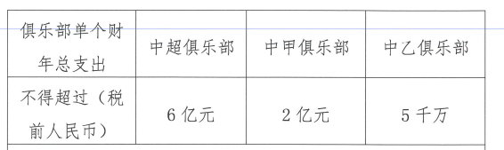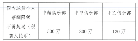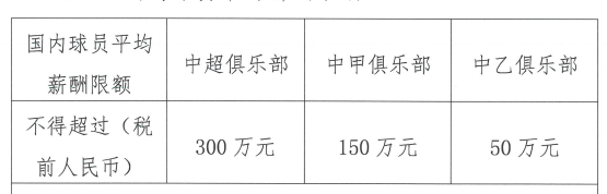 官方文件截圖 就球員薪資,《指標》規定,以稅前計,中超俱樂部國內球員個人薪酬不得超過500萬元人民幣,中甲俱樂部國內球員個人薪酬不得超過300萬元人民幣,中乙俱樂部國內球員個人薪酬不得超過120萬元人民幣;中超俱樂部國內球員平均薪酬不得超過300萬元人民幣,中甲俱樂部國內球員平均薪酬不得超過150萬元人民幣,中乙俱樂部國內球員平均薪酬限額不得超過50萬元人民幣。