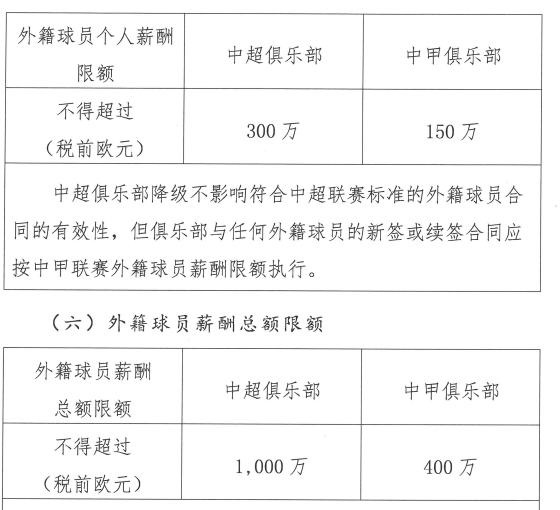 官方文件截圖 關於外籍球員薪酬,《指標》規定,以稅前計,中超俱樂部外籍球員個人薪酬不得超過300萬歐元,中甲俱樂部外籍球員個人薪酬不得超過150萬歐元;中超俱樂部外籍球員薪酬總額不得超過1000萬歐元,中甲俱樂部外籍球員薪酬總額不得超過400萬歐元。(完)
