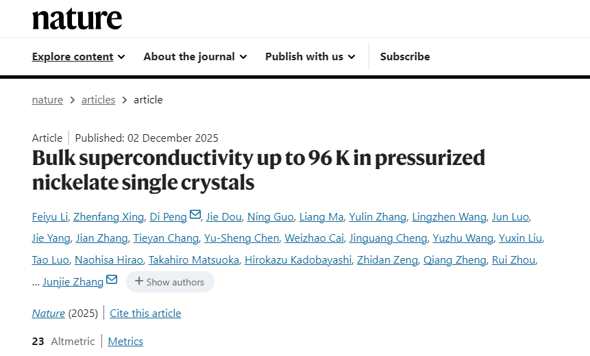 圖源:《自然》網站截圖 作為高溫超導體系“新貴”,鎳基氧化物研究仍面臨兩大挑戰:一是體塊單晶依賴高壓制備;二是最高超導轉變溫度僅83K(-190.15℃),遠低於銅基超導體的164K(-109.15℃)。 為了設計與合成更高Tc的鎳基高溫超導體,研究團隊首創常壓助熔劑法,以碳酸鉀為助熔劑,在常壓下成功生長了系列雙層鎳氧化物單晶。測試表明,單晶具有良好的成分均勻性和高的晶體質量,為高溫超導機理研究提供了優質材料平台。同時,該材料在單斜、四方兩種結構下均能超導,為解決鎳基高溫超導機理問題提供了重要結構基礎。 該團隊還首次發現“晶格畸變越大,超導溫度越高”的關鍵規律。基於此規律,該團隊創造了全球最高鎳基超導體轉變溫度紀錄——96K(-177.15℃)。(完) 【編輯:彭玉婷】