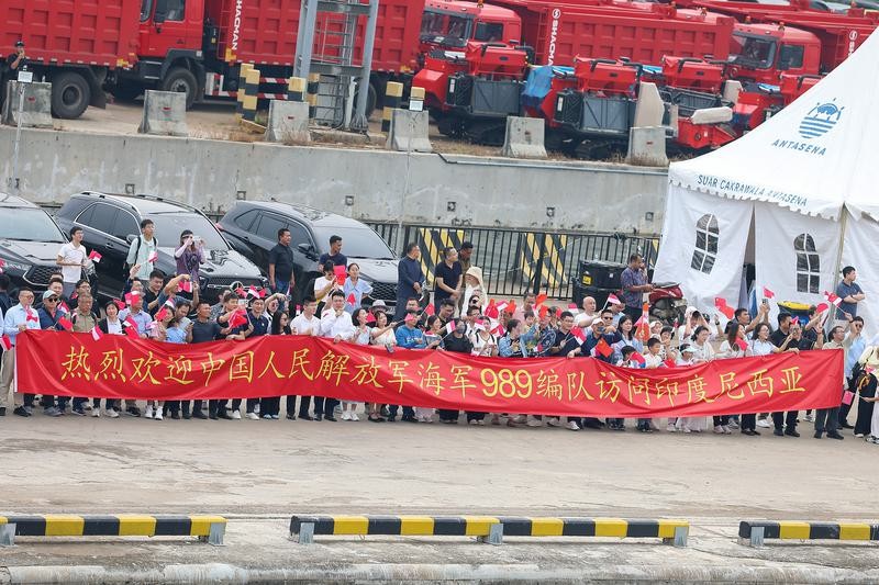 12月7日,中國海軍989編隊艦艇靠泊印度尼西亞雅加達丹戎不碌港。圖片來源:新華社 據中國海軍當天介紹,上午10時許,懸掛著中印尼兩國國旗的中國海軍989編隊艦艇在熱烈的歡迎聲中,緩緩靠泊雅加達丹戎不碌港碼頭,來自海軍工程大學和海軍航空大學的學員在甲板分區列隊,向前來迎接的人群揮手致意。 中國駐東盟使團工作人員、中國駐印尼使館工作人員、留學生代表、當地華僑華人代表、印尼海軍官兵代表等400餘人到碼頭迎接。編隊在抵達印尼後,此次隨編隊出航同訓的外國海軍軍官和學員將結束實習訓練離艦。
