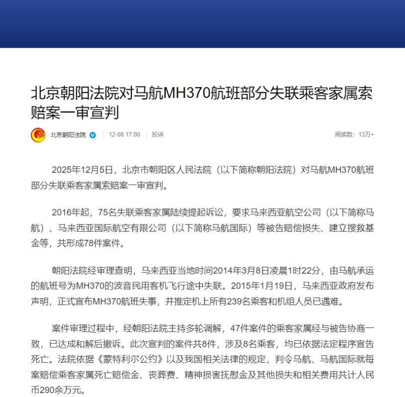 圖源:“北京朝陽法院”微博截圖 2016年起,75名失聯乘客家屬陸續提起訴訟,要求馬來西亞航空公司(馬航)、馬來西亞國際航空有限公司(馬航國際)等被告賠償損失、建立搜救基金等,共形成78件案件。 朝陽法院經審理查明,馬來西亞當地時間2014年3月8日凌晨1時22分,由馬航承運的航班號為MH370的波音民用客機飛行途中失聯。2015年1月19日,馬來西亞政府發布聲明,正式宣布MH370航班失事,並推定機上所有239名乘客和機組人員已遇難。 案件審理過程中,經朝陽法院主持多輪調解,47件案件的乘客家屬經與被告協商一致,已達成和解後撤訴。此次宣判的案件共8件,涉及8名乘客,均已依據法定程序宣告死亡。法院依據《蒙特利爾公約》以及中國相關法律的規定,判令馬航、馬航國際就每案賠償乘客家屬死亡賠償金、喪葬費、精神損害撫慰金及其他損失和相關費用共計人民幣290餘萬元。 其餘23件案件,乘客家屬尚未申請宣告乘客死亡或尚未完成宣告程序,仍在審理程序中。(完) 【編輯:彭玉婷】