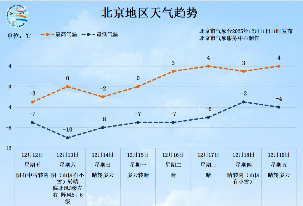 北京地區天氣趨勢圖。(北京市氣象台發布) 氣溫方面,12日白天最高氣溫將驟降至-3℃,13日夜間最低氣溫更將跌至-10℃。降雪結束後,北風加大,13日白天有3級左右偏北風,陣風達6級,西部山區陣風或超7級,風寒效應顯著。氣象部門提醒市民密切關注最新天氣信息,做好防寒防滑措施,確保安全出行。(完) 【編輯:彭玉婷】