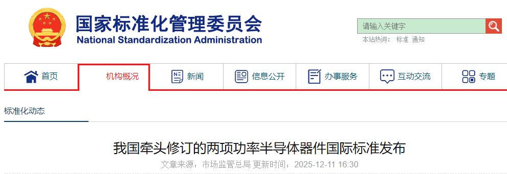 圖源:國家市場監管總局網站截圖 據介紹,這是中國深度參與功率半導體器件國際標準化工作的重要突破,為全球電能轉換與控制技術的規範化、產業化注入“中國智慧”。 這兩項國際標準解決了標準技術內容長期與產品發展不匹配、不適應問題,提升了大功率半導體器件測試的適用性和可操作性,將成為全球製造商、用戶及第三方檢測機構進行產品研發、檢測和應用的重要依據,有助於提升中國電力電子產業整體技術和質量水平。 整流二極管和晶閘管都是基礎半導體器件,不僅廣泛應用在手機充電器、燈光調節、吸塵器調速、電磁爐功率控制等家用電器中,還廣泛應用於電動汽車及其充電樁、新能源發電、新型電力系統、智能電網、工業自動化以及航空航天等領域。(完) 【編輯:彭玉婷】