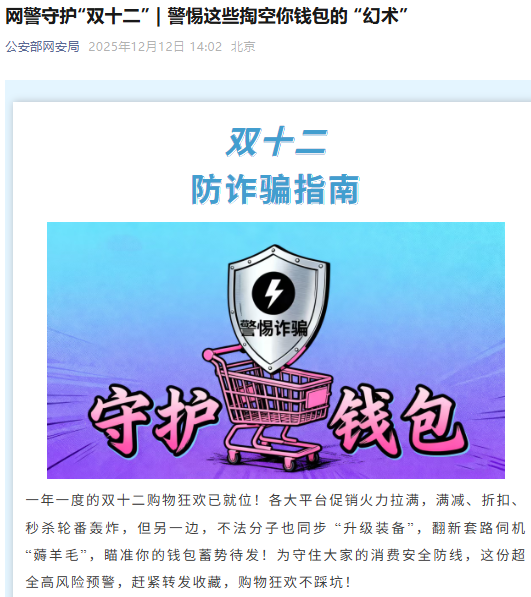 圖片來源:“中國公安部網絡安全保衛局”公眾號截圖 陷阱一:掃碼“補貼”。陌生快遞宣傳冊或短信里的誘人福利,實則藏著套路。掃碼後動輒要求添加私人客服、進群領“專屬優惠”,背後竟是誘導轉賬的陷阱,或是植入木馬病毒、盜取個人信息進而盜刷。 陷阱二:刷單返利。“輕鬆日賺數百”“雙12衝銷量高返利”這類誘人話術背後經常藏著刷單陷阱。先以小額刷單快速返現獲取信任,等消費者大額轉賬後,便用“任務未完成”“系統卡單”等借口拒不退款,甚至變本加厲誘導消費者繼續投錢“解鎖提現”,一步步套走消費者的資金。 陷阱三:冒充客服退款/理賠。一些看似貼心的“售後客服”,實則是不法分子。他們會趁機誘導消費者點擊陌生鏈接、填寫銀行卡號與驗證碼,或是以“墊付理賠金”為由要求私下轉賬,步步設套盜取消費者的錢財。 陷阱四:虛假紅包/中獎。群組里突然冒出來的“雙12大額紅包”“免單中獎”鏈接,號稱點一點就能輕鬆薅羊毛,卻要求填寫手機號、身份證號才能領取?這些鏈接實則是不法分子的“信息收割機”,要麼偷偷收集消費者的個人敏感信息,要麼把消費者引流到釣魚網站,後續風險重重。 陷阱五:信用提額。有人冒充銀行客服,打著提額旗號,動輒要求消費者掃碼繳納“服務費”“保證金”,實則純純陷阱。正規平台的提額服務從不收取任何額外費用。(完) 【編輯:林曉惠】