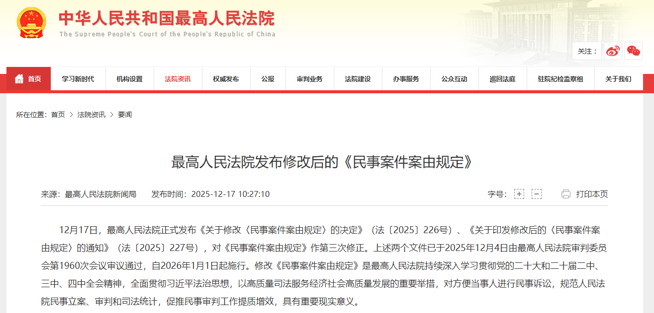 香港中通社12月17日電 中國最高人民法院17日正式發布《關於修改〈民事案件案由規定〉的決定》《關於印發修改後的〈民事案件案由規定〉的通知》,對《民事案件案由規定》作第三次修正。上述兩個文件已於2025年12月4日由中國最高人民法院審判委員會第1960次會議審議通過,自2026年1月1日起施行。