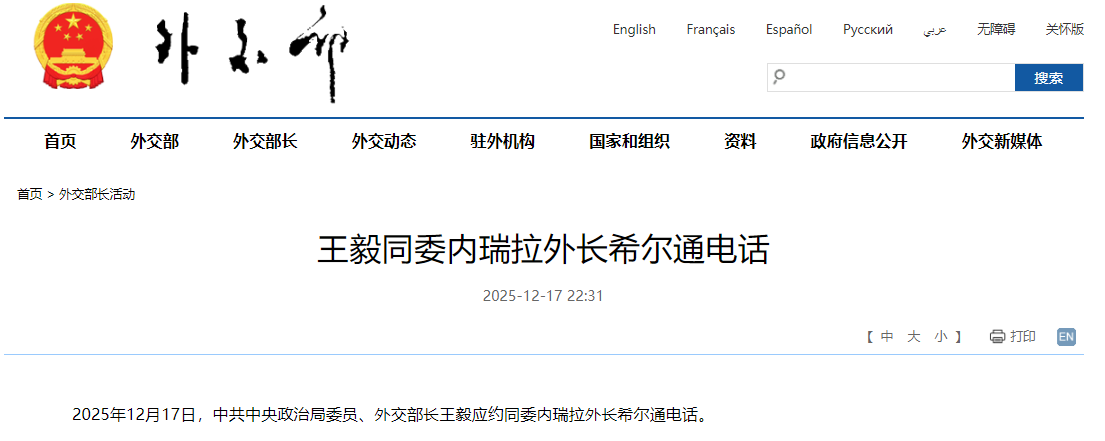圖源:中國外交部網站截圖 據中國外交部當晚消息,通話中,希爾通報了當前委國內形勢,強調委政府和人民將堅定捍衛國家的主權和獨立,堅定維護自身的合法權利,不會接受任何強權霸凌的威脅。 王毅表示,中國和委內瑞拉是戰略夥伴,相互信任、相互支持是中委關係的傳統。 近期,美國以“緝毒”為由,在委附近加勒比海域部署多艘軍艦,對委施壓。美國總統特朗普11月底威脅可能“很快”通過陸路打擊委“毒販”。 12月10日,特朗普在白宮對媒體說,美軍在委附近海域扣押了一艘油輪,是“迄今扣押的最大一艘”。委外長希爾當天通過社交媒體發布政府公報,譴責美軍在委附近海域扣押油輪。公報說,美長期侵略委的真正理由已經顯現,美方一直企圖佔有委包括石油在內的自然資源。 另外,隨著近期美國的軍事和政治施壓加劇,多家國際航空公司近日陸續暫停往返委航線。(完) 【編輯:彭玉婷】