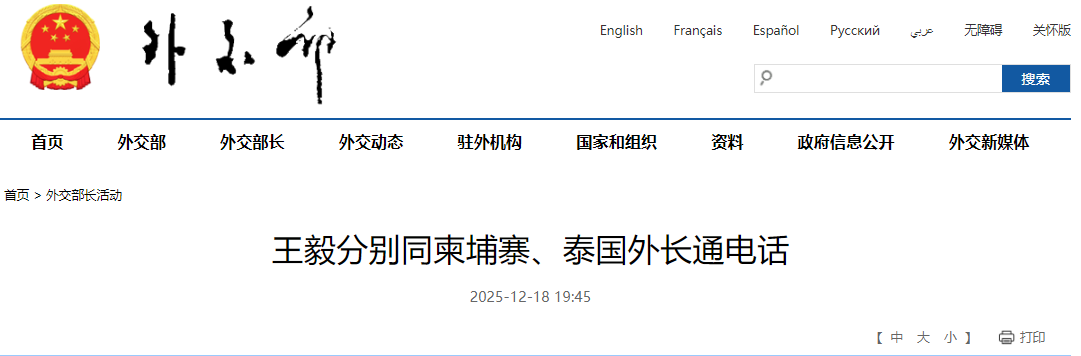 圖源:中國外交部網站截圖 據中國外交部官網消息,王毅表示,作為柬泰兩國的朋友和近鄰,中方最不希望看到兩國兵戎相見,對衝突造成雙方平民傷亡深感痛心。此輪衝突烈度遠超以往,持續下去對雙方都無益,也有損東盟的團結。當務之急是做出決斷、盡快停火、及時止損、重建互信。 王毅說,中方在柬泰邊境爭端問題上堅持勸和促談、公平公允,支持東盟的調停努力。中國外交部亞洲事務特使已啟程赴柬、泰穿梭溝通,中方將繼續牽線搭橋,為推動柬泰重建和平發揮建設性作用。希望兩國採取有效措施保障中方項目和人員安全,警惕有人散布不實之詞抹黑中國同兩國的友好關係。 布拉索昆、西哈薩高度讚賞中方秉持客觀公正立場、居中勸和促談,歡迎中方特使穿梭調停,期待中方為推動局勢降溫及重建和平發揮更重要作用。(完) 【編輯:彭玉婷】