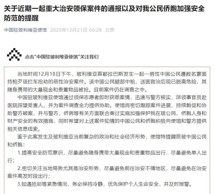 圖源:“中國駐玻利維亞使館”公眾號截圖 據中國駐玻利維亞使館公眾號消息,事件發生於當地時間12月18日下午,一名男性中國公民在玻利維亞首都拉巴斯駕車途中遭數名蒙面持槍歹徒攔車搶劫,腿部中彈,所攜大量現金及貴重物品被搶走。 據報,受害人已送醫救治,目前脫離生命危險。案發後,中使館通過領保志願者第一時間獲悉情況,迅速與當地警方核實,並派領事官員赴醫院探望傷者,同時全力協助案件調查。中使館表示,將持續敦促玻方加快偵辦,並正與警方、僑界等合作,研究加強在玻中國公民和僑胞人身與財產安全的保護措施。 鑒於玻利維亞當前複雜的政治與社會經濟形勢,以及此案暴露出的治安風險,中使館特別向旅居當地的中國公民和僑胞發出三點安全提醒:一是提高防範意識,避免攜帶大量現金或貴重物品外出,盡量不單獨出行;二是密切關注當地治安動態,避免前往高風險區域或在案件高發時段外出;三是如遇搶劫等緊急情況,務必保持冷靜,優先確保人身安全,並立即報警。 中使館同時呼籲知情的中國公民或僑胞積極向使館或當地警方提供線索,協助破案。玻利維亞報警電話為(591)110或120,中國駐玻使館領事保護熱線為00591-72028168。(完) 【編輯:彭玉婷】