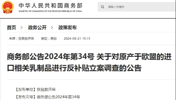中方對歐盟乳製品實施臨時反補貼措施分享到: