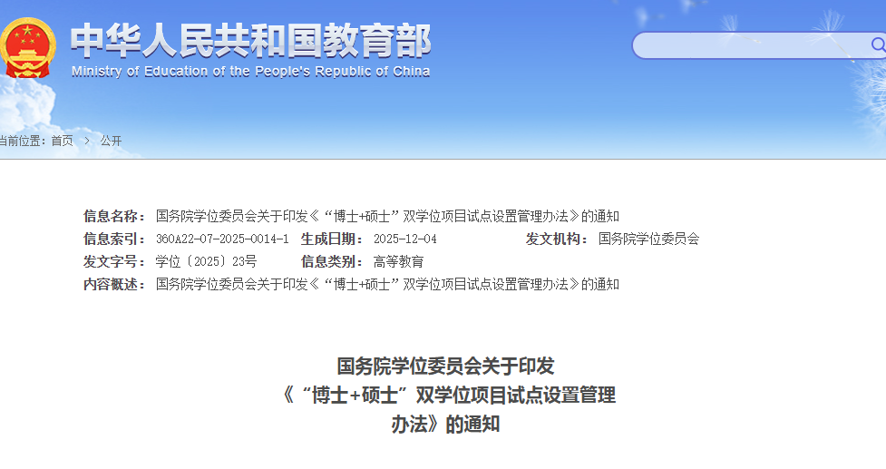 中國教育部網站截圖 中國教育部學位管理與研究生教育司負責人29日介紹,“博士+碩士”雙學位項目由試點高校自主設置,圍繞科技發展、產業變革、自主知識體系構建等重大需求,依託具有顯著優勢的學科專業和學科交叉平台,組織多學科交叉融合、協同育人,支持項目學生在攻讀博士學位期間同時攻讀另一個學科專業的碩士學位,培養具備跨學科視野、具有較強學科交叉研究和轉化應用實踐能力的高層次複合型人才。 據介紹,“博士+碩士”雙學位項目試點設置工作堅持“少而精”。一是試點高校由中國國務院學位委員會辦公室根據學科交叉平台建設情況、人才培養質量等因素在博士學位授予資格自主審核單位範圍內遴選確定。二是有關高校依託學科交叉平台、跨學科創新研究團隊、科研項目等情況有組織地論證並試點設置少量項目。三是項目的培養對象應是少數有能力在完成博士學業同時可以攻讀相關碩士學位的博士研究生,項目學生應分別達到學位授予單位對於兩個學位的要求,方可申請相應學位。(完) 【編輯:淩玉輝】