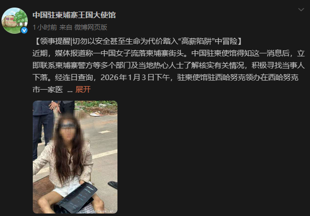 圖片來源:中國駐柬埔寨大使館微博賬號截圖 據悉,近期媒體報道稱一名中國女子流落柬埔寨街頭。大使館得知相關媒體報道後,立即啟動應急機制,聯動柬埔寨警方、地方政府及當地熱心人士全力核查信息並搜尋當事人。經連續多日查詢,於3日下午,駐柬使館駐西哈努克領辦在西哈努克市一家醫院找到該吳姓女子。 使館方面表示,發現時該女子身體狀況很差,領辦當即協調將其轉送至另一家醫院救治。據該女子反映,其受“高薪工作”誘惑來柬,後流落街頭。目前,該女子身體狀況有所好轉,領辦已聯繫其家屬來柬辦理接其回國事宜。 針對此案,大使館再次發布重要警示:所謂海外“高薪招聘”信息,很多涉及網賭電詐、黃賭毒等灰黑產業,一旦身陷其中,極易遭到非法拘禁、暴力虐待,甚至面臨生命危險。切勿輕易聽信傳言,以自身安全甚至生命為代價鋌而走險。如發現本人或身邊人員受到電詐、非法拘禁等威脅,請儘快向中柬兩國警方報警,並聯繫中國駐柬使館尋求協助。(完) 【編輯:林曉惠】