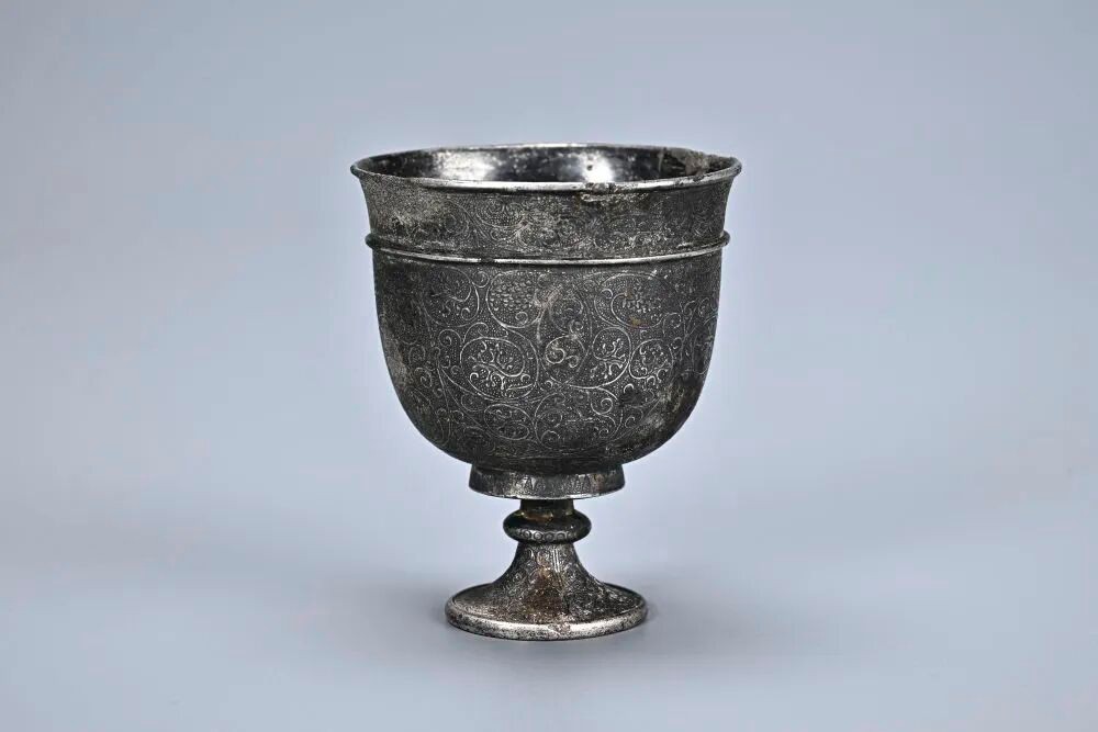馬三娘墓葬中發現的高腳杯(陝西省考古研究院) 陝西省考古研究院館員史晟介紹,該墓隨葬金銀器多為女性發飾及盛貯器,墓中所出的銀三足罐及銀高足杯,器身以具有西域特色的葡萄忍冬紋為主紋,可見當時中原與西域地區交往密切。所出金銀器與薩珊銀幣具有較高研究價值,為研究盛唐時期的中外文化交流及貿易往來,提供了新的實物資料。此外,馬三娘墓志所載家族情況及墓主生平,有助於補全董氏家族譜系,完善董氏家族背景。