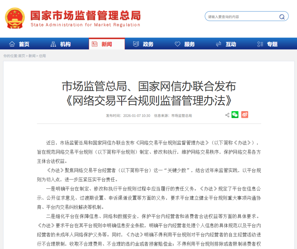 中國國家市場監管總局網站截圖 據“市說新語”7日消息,《辦法》對網絡平台濫用規則權力劃出多條明確紅線,重點聚焦保護平台內經營者與消費者合法權益,被視為平台經濟邁向精細化、法治化治理的關鍵一步。 《辦法》於去年12月發布,依據《電子商務法》、《消費者權益保護法》、《網絡安全法》等制定。其中最引人關注的是對平台不當干預市場行為的嚴格禁止:平台不得利用其制定的規則對商家自主經營實施不合理限制,包括強制“二選一”、設定歧視性條款或技術壁壘;同時,明確禁止收取不合理的費用、違約金或損害賠償金,防止平台藉規則之名行盤剝之實。 在消費者權益方面,《辦法》首次在部門規章層面點名打擊“大數據殺熟”——即平台基於用戶數據差異化定價、損害老用戶利益的行為。此外,平台不得通過規則排除或限制消費者享有的退貨、索賠、評價等權利,不得單方面減免自身責任、不合理加重消費者負擔。針對日益普遍的會員服務,《辦法》特別規定,平台不得在未經協商情況下隨意變更會員權益規則,損害付費用戶的合理期待。 此外,《辦法》要求平台在其規則中明確信息安全條款,規範平台內經營者處理個人信息的行為,落實最小必要、知情同意等原則。同時,平台須督促商家履行未成年人網絡保護義務,防止誘導未成年人非理性消費或接觸不適宜內容。 業界專家指出,《辦法》從“規則源頭”切入,將過去分散於個案處罰中的監管要求制度化、常態化,有助於扭轉平台“既當裁判員又當運動員”的失衡格局。隨著2月1日施行日臨近,各大平台正加快合規調整,市場預期網絡交易生態將迎來更公平、透明的新階段。(完) 【編輯:彭玉婷】