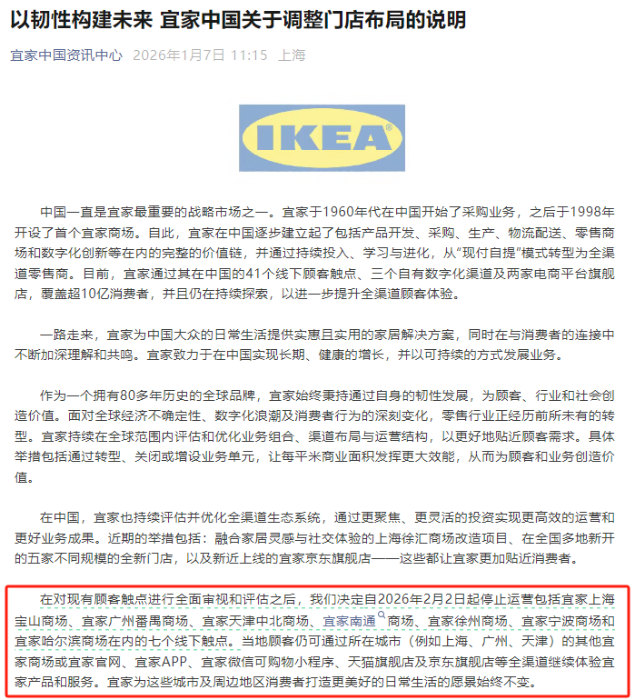 宜家中國在微信公眾號發布《關於調整門店布局的說明》 宜家中國當日在微信公眾號發布《關於調整門店布局的說明》,強調此舉是基於對現有41個線下顧客觸點的全面評估。儘管上述7城部分消費者將失去就近的大店服務,但當地顧客仍可通過同城其他宜家商場(如上海市區徐匯店、廣州天河店等),或通過宜家官網、APP、微信小程序及天貓、京東旗艦店等全渠道繼續購物。 據內地媒體報道,1月7日上午宜家客服回應一度混亂:早間稱“暫無通知”,哈爾濱商場甚至僅稱“暫停營業兩日”;但至當天上午10時50分,客服已確認7家門店確將於2月1日結束營業,並承認網傳名單屬實。 宜家強調,中國仍是其全球最重要戰略市場之一。未來兩年,公司將聚焦北京、深圳等核心城市,開設超過10家小型門店,包括今年2月開業的東莞商場及4月啟用的北京通州店。此類新店面積更小、選址更靈活,融合家居靈感與社交體驗,旨在貼近都市消費習慣。 同時,宜家將持續加碼線上布局。自2018年進軍電商以來,其已建成三大自有數字渠道與兩大電商平台旗艦店,覆蓋超10億消費者。宜家指出,此次關店並非撤退,而是優化資源配置,關停效能偏低的大店,轉投高效率、高觸達的小型門店與數字生態。 宜家1998年進入中國內地零售市場,歷經從“現付自提”到全渠道零售商的轉型。分析指,此次戰略調整,凸顯其在零售業深度變革與消費行為數位化浪潮下的主動求變。(完) 【編輯:彭玉婷】
