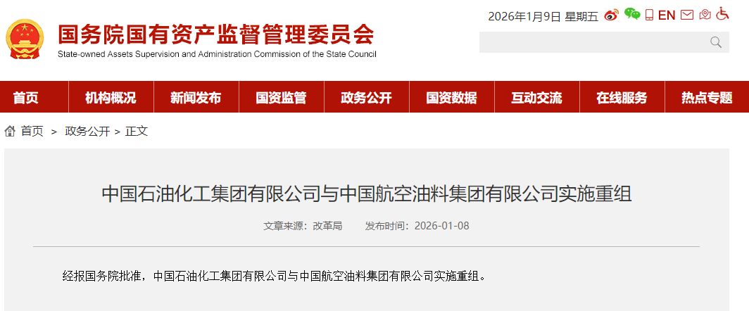 香港中通社1月8日電 1月8日,中國國務院國資委正式宣布,經國務院批准,中國石油化工集團有限公司(中國石化)與中國航空油料集團有限公司(中國航油)實施重組。此舉標誌著中國航空燃料產業迎來重大整合,在提升產業鏈韌性、保障航空能源安全,加速綠色低碳轉型方面邁進。