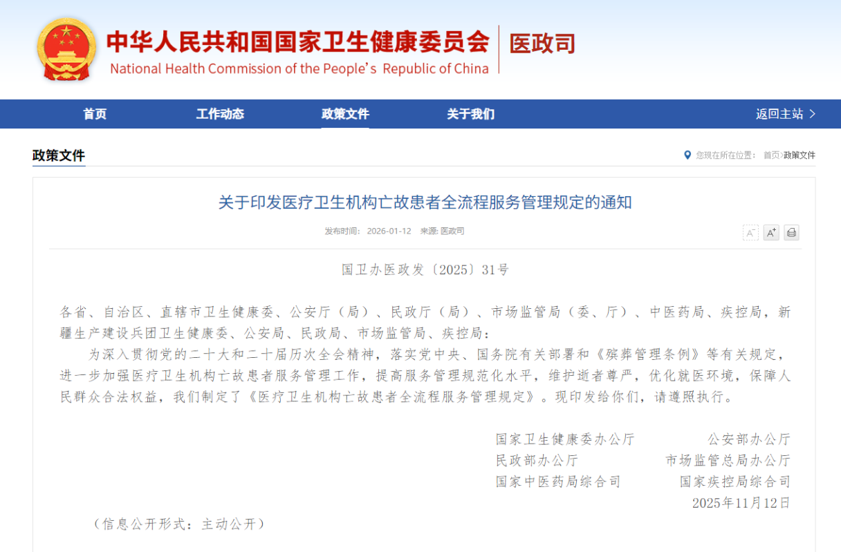 1月12日,中國國家衛健委等六部門發布《醫療衛生機構亡故患者全流程服務管理規定》 該規定詳細劃分了死亡證明的開具責任。在醫療機構內或來院途中正常死亡者,由救治機構簽發《居民死亡醫學證明(推斷)書》;在家中或其他場所正常死亡的,由當地鄉鎮衛生院或社區衛生服務中心簽發;非正常死亡需開具證明的,則由公安機關派出所負責。 該規定要求醫療機構優化遺體處置流程,可設置遺體暫存區(太平間僅提供暫存服務)。患者死亡後,應快速移至暫存區,並通知家屬聯繫殯儀館接運。遺體在暫存區停放一般不應超過24小時,特殊情況需盡快轉運至殯儀館。 此外,該規定劃定多個“嚴禁”,劃清醫療機構的服務紅線:嚴禁機構內任何場所陳列、售賣殯葬用品;嚴禁外包太平間或引入第三方提供殯儀服務;嚴禁接收、存放院外遺體;嚴禁使用院前急救車輛、非急救醫療轉運車輛轉運遺體。 為保護逝者及家屬隱私,防止信息洩露和誘導消費,規定要求醫療機構建立個人信息保護制度,工作人員不得違規提供喪屬信息,不得推薦、誘導家屬到指定殯葬機構消費。(完) 【編輯:彭玉婷】