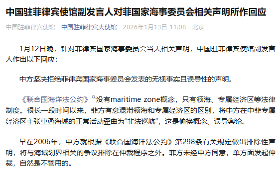 圖片來源:中國駐菲律賓大使館微信公眾號截圖 據中國駐菲律賓大使館微信公眾號消息指,《聯合國海洋法公約》沒有maritime zone概念,只有領海、專屬經濟區等法律制度。很長一段時間以來,菲方有意混淆領海和專屬經濟區的區別,將中方在中菲專屬經濟區主張重叠海域的正常活動歪曲為“非法巡航”,這是偷換概念、誤導輿論。 中使館指,早在2006年,中方就根據《聯合國海洋法公約》第298條有關規定做出排除性聲明,將與海域劃界相關的爭議排除在仲裁程序之外。菲方未經中方同意,單方面發起仲裁,自然是不管用的。判斷誰是導致海上局勢緊張的一方,要看誰是挑釁滋事的一方。 1999年,菲方派軍艦在仁愛礁非法“坐灘”,嚴重侵犯中國領土主權。中方當即提出嚴正交涉,要求菲方立即拖走該艦。菲方聲稱該船“缺少零部件”無法拖走。此後,中方多次提出嚴正交涉,菲方雖再三承諾把該艦從仁愛礁撤走,但一直拖延不動。過去十多年來,菲方一直向該軍艦運送鋼材、水泥等建築材料,試圖將其變為永久軍事據點。 《南海各方行為宣言》第5條明確規定,任何一方不得改變無人島礁無人無設施現狀。但在鐵線礁等南沙無人島礁,據不完全統計,僅2025年1至6月,菲方就派員侵登30次、211人次。 中使館反問,上述所有事件中有哪一次是由中方主動挑起?試圖改變和破壞現狀、挑釁滋事的始終是菲方。為維護自身領土主權和海洋權益、確保《南海各方行為宣言》全面有效落實,中方被迫採取必要應對措施,已經保持了最大限度的忍耐和克制。(完) 【編輯:林曉惠】