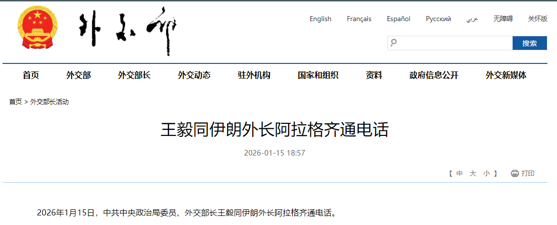 圖源:中國外交部網站截圖 王毅稱,中方相信伊政府和人民將團結一致,克服困難,保持國家穩定,維護正當權益。希望各方珍惜和平,保持克制,通過對話解決分歧,中方願為此發揮建設性作用。 阿拉格齊通報了伊朗局勢最新進展,強調伊近期騷亂系外部勢力煽動所致,目前已恢復平穩。伊方已作好應對外部干涉準備,同時對話大門仍然敞開,期待中方為地區和平穩定發揮更大作用。 近期,伊朗多地發生抗議活動,其間出現騷亂,造成人員傷亡。連日來,美國總統特朗普多次威脅軍事干涉伊朗局勢。 伊朗15日凌晨發布航行通告,宣布暫時關閉領空,關閉時長5個多小時。據美國媒體報道,美軍“林肯”號航母打擊群已被調往中東地區,外媒稱所有跡象表明美對伊朗的襲擊“迫在眉睫”。(完) 【編輯:彭玉婷】