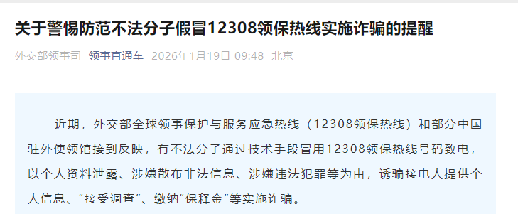 香港中通社1月19日電 據中國外交部領事司19日消息,近期,中國外交部全球領事保護與服務應急熱線(12308領保熱線)和部分中國駐外使領館接到反映,有不法分子通過技術手段冒用12308領保熱線號碼致電,以個人資料洩露、涉嫌散布非法信息、涉嫌違法犯罪等為由,誘騙接電人提供個人信息、“接受調查”、繳納“保釋金”等實施詐騙。