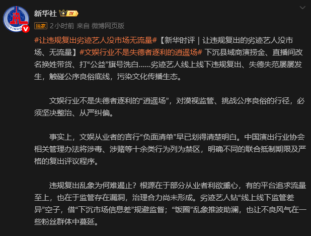19日,中國官媒新華社發布《讓違規復出的劣跡藝人沒市場、無流量》評論文章。圖源:新華社微博賬號截圖 文章指出,文娛行業不是失德者逐利的“逍遙場”,對漠視監管、挑戰公序良俗的行徑,必須堅決整治、從嚴糾偏。事實上,文娛從業者的言行“負面清單”早已劃得清楚明白。中國演出行業協會相關管理辦法將涉毒、涉賭等十餘類行為列為禁區,明確不同的聯合抵制期限及嚴格的復出評議程序。 文章反問,違規復出亂象為何難遏止?根源在於部分從業者利欲熏心,有的平台追求流量至上,也在於監管存在漏洞,治理合力尚未形成。劣跡藝人鑽“線上線下監管差異”空子,借“下沉市場信息差”規避監督;“飯圈”亂象推波助瀾,也讓不良風氣在一些粉絲群體中蔓延。 文章進一步表示,文藝承擔著成風化人的職責。對亂象整治須直擊要害,堵住監管漏洞、劃實規範紅線。對演藝活動的監管不能止步於對經紀公司提交的合同、證照做形式審查,不能只是“流程蓋章”的走過場。行業協會也要繃緊自律之弦,嚴格執行聯合抵制機制,淨化行業生態,對違規復出堅決說“不”。針對有些劣跡藝人線上“借網重生”,平台不能“裝睡”。要摒棄流量至上,優化算法邏輯,把好審核關口,完善舉報機制,及時發現和下架劣跡藝人相關內容和不良導向視頻,不留傳播空間。 文章表示,源清則流清,行正則業興。嚴規矩、實監管,讓違法失德者無漏洞可鑽、無市場可依,才能更好引導文娛行業回歸本源,讓正氣充盈文化傳播空間。(完) 【編輯:彭玉婷】