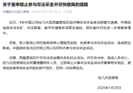 圖片來源:中國駐幾內亞大使館微信公眾號截圖 消息稱,目前,極少數中國公民仍抱有僥幸心理鋌而走險,執意參與非法採金活動,造成惡劣影響。中國政府堅決反對中國公民以任何形式參與非法採金活動。 近期,西基里地區針對非法採金爆發多輪抗議活動,並引發衝突,造成人員傷亡。中國駐幾內亞使館在此鄭重提醒相關人員,立即停止從事非法採金活動並撤離相關地區,避免給自身帶來安全風險和財產損失,否則一切後果自負。(完) 【編輯:林曉惠】