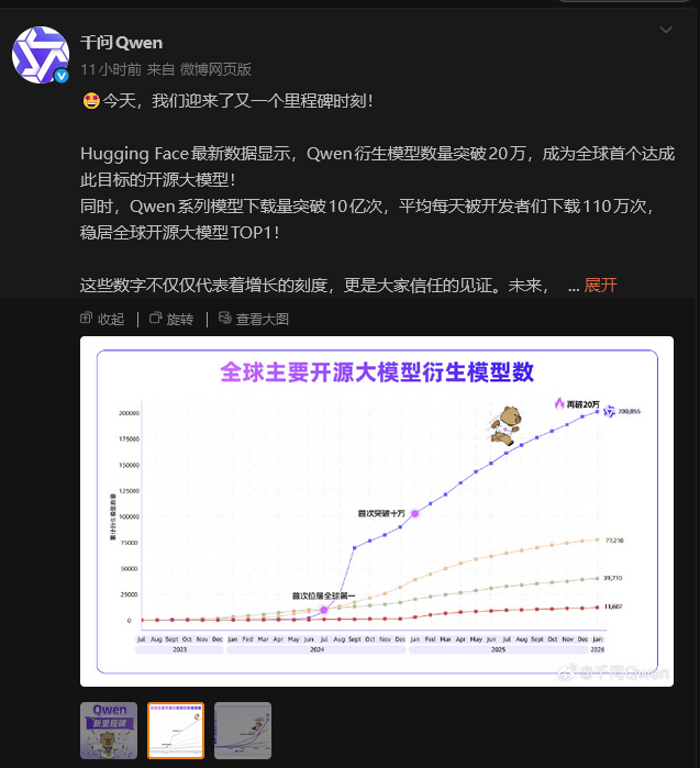 圖源:“千問”社交媒體截圖 全球最大AI開源社區Hugging Face最新數據顯示,衍生模型數量被廣泛視為衡量開源模型生態影響力的核心指標。自2023年啟動開源以來,阿里已發布近400個基礎模型,覆蓋從0.5B到110B參數的全尺寸矩陣,在輕量級模型布局上取得先發優勢。 2025年下半年,“千問”下載量首次超越Meta;同年12月單月下載量更超過排名第二至第九位廠商(包括OpenAI、Mistral、英偉達等)總和,增長勢頭強勁。 目前,全球開發者每天基於“千問”新增超200個衍生模型,應用場景橫跨機器人控制、代碼生成、多語種翻譯、漫畫後期製作等領域。斯坦福李飛飛團隊亦基於“千問”訓練出新模型S1,推動AI推理研究邊界。 除技術開源外,“千問”在應用端同步實現重大突破。1月15日,“千問”App完成重大升級,全面接入淘寶、支付寶、飛豬、高德等阿里生態服務,用戶可通過自然語言指令直接完成點外賣、購物、訂機票等複雜任務。 業界分析指,此舉標誌著AI助手從“聊天對話”正式邁入“辦事時代”,目前已上線超400項AI辦事功能,成為全球少有的可執行真實生活任務的全能AI助手。(完) 【編輯:彭玉婷】