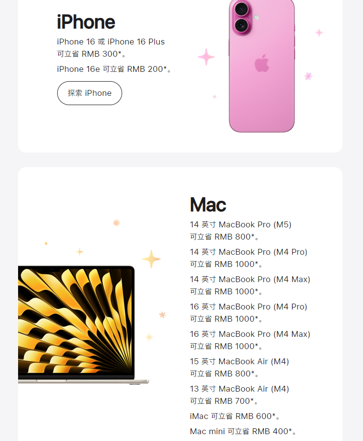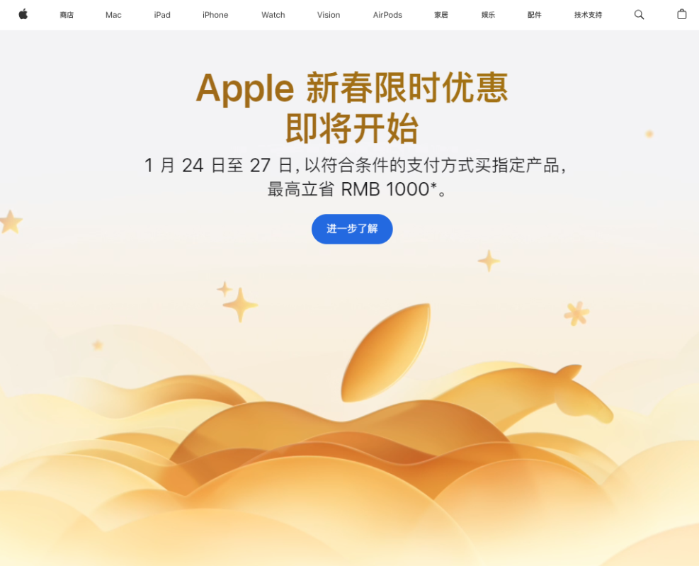 香港中通社1月22日電 蘋果中國官網22日上線新春限時優惠活動,用戶於24日0時1分至27日23時59分以符合條件的支付方式購買iPhone、Mac、iPad和Apple Watch等指定產品,最高可立省1000元人民幣。不過,最新發布的iPhone 17系列手機產品不在降價範圍內。