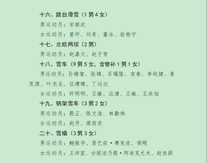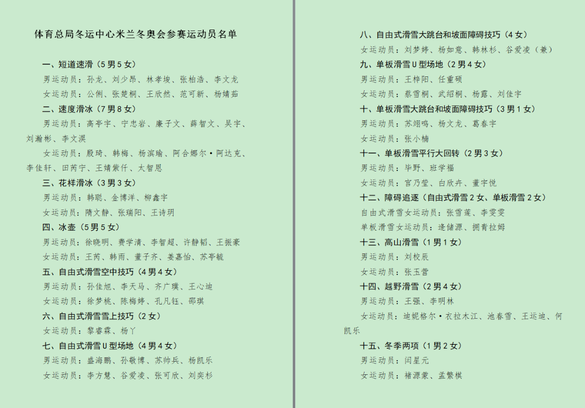 名單。圖源:中國國家體育總局冬季運動管理中心文件截圖 據公示,10位冬奧冠軍領銜,包括谷愛凌、蘇翊鳴、徐夢桃、齊廣璞、隋文靜、韓聰、高亭宇、范可新、劉少昂和林孝埈,組成史上“星味最足”的中國冬奧陣容。 衝金主力集中在傳統優勢項目:自由式滑雪空中技巧由徐夢桃、齊廣璞帶隊,男女個人及混合團體均具奪金實力;谷愛凌將主攻U型場地技巧,與李方慧、張可欣形成“雙保險”;蘇翊鳴則在男子單板滑雪大跳台和坡面障礙技巧中保持世界頂尖水平。短道速滑方面,林孝埈、劉少昂領銜男隊,在男子500米、5000米接力及男女混合接力中具備爭金能力。 與此同時,花樣滑冰雙人滑組合隋文靜/韓聰有望衝擊獎牌。值得注意的是,中國隊首次實現新增項目——滑雪登山的滿項參賽,次旦玉珍與布魯爾將出戰混合接力及短距離賽,力爭在新設項目中創造突破。 此外,上海選手應清(雪車)與徐曉明(冰壺)雙雙入選,彰顯“北冰南展”戰略成效。盡管挑戰重重,中國冰雪健兒仍將憑借經驗與韌性,在米蘭雪場上奮力拼搏,爭取境外冬奧最佳戰績。 本屆冬奧會將於2月6日在意大利開幕,至2月22日結束。(完) 【編輯:彭玉婷】