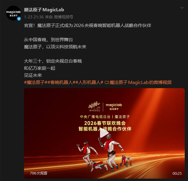 圖源:魔法原子社媒賬號截圖 銀河通用成立於2023年5月,註冊地在北京,主要在商業、工業、醫療等場景提供智能機器人產品。截至2025年,其核心產品Galbot G1人形機器人已在北汽、寧德時代等企業實現千台級工業訂單交付,醫療領域與北京宣武、華西醫院等建立合作。去年12月,銀河通用宣布完成新一輪超3億美元融資,公司估值超過30億美元。 魔法原子於2024年1月成立,2024年底將總部從北京遷移至江蘇無錫,並同步在上海設立分公司。旗下主要產品包括全尺寸人形機器人MagicBot Gen1、小人形機器人MagicBot Z1、四足機器狗MagicDog及靈巧手等,覆蓋工業、商業及家庭等多類場景。(完) 【編輯:彭玉婷】