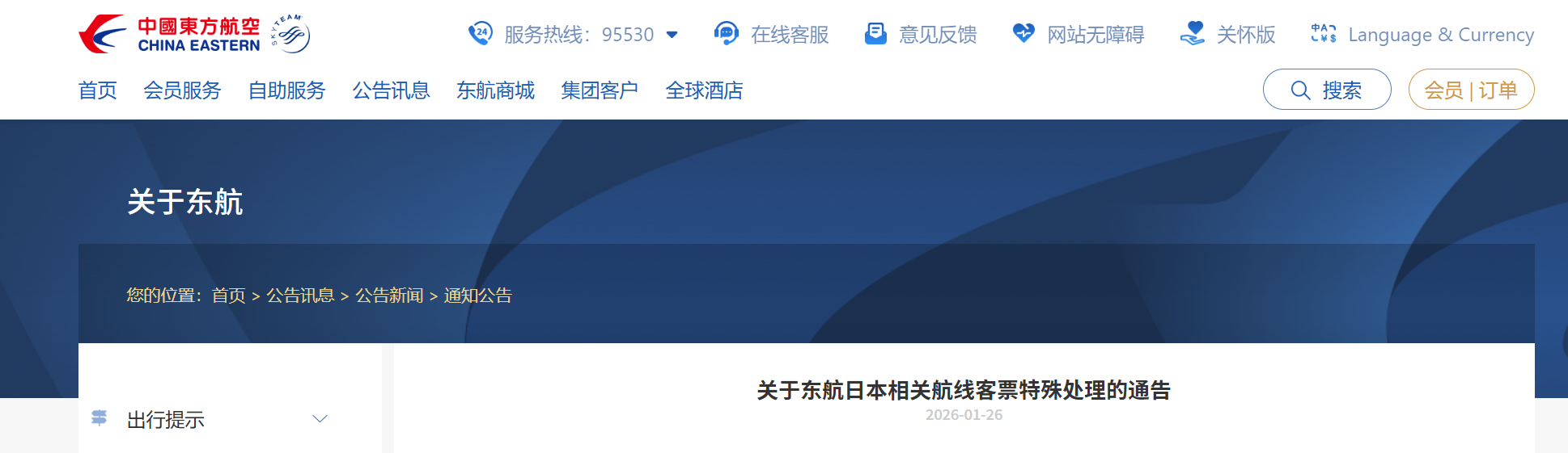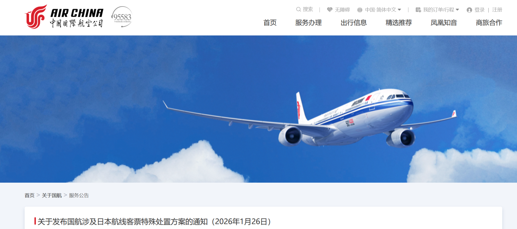 中國三大航司發布《關於日本航線客票特殊處理的通知》 中國國航公告指出,在2026年1月26日12時(含)前購買或換開產生新票號的國航999開頭的客票(包括里程獎勵客票);客票未使用行程涉及旅行日期為2026年3月29日(含)至2026年10月24日(含)之間東京、大阪、名古屋、福岡、仙台、廣島、札幌、沖繩進出港的國航實際承運航班和掛CA航班號的代碼共享航班;在2026年1月26日0時(含)以後申請客票變更或退票(以取消客票訂座時間為準),在客票有效期內,首次變更免收變更手續費,但需收取子艙位差價及淡旺季差價,再次變更需依據客票使用條件辦理。在客票有效期內,可以辦理未使用航段退票,免收退票手續費。 東航公告指出,辦理變更至原航班前後3天(含)以內的航班,可免費變更一次。再次變更或變更超出原航班前後3天(含)內的航班,需依據客票使用條件辦理。在客票有效期內,可至原購票渠道辦理未使用航段非自願退票,免收退票手續費。 南航此次公告指出,客票變更首次變更至相同航程的南航實際承運航班,免收變更費,如發生票價價差按規定收取。再次變更需依據客票使用條件辦理。退票在客票有效期內申請退票,免收退票費。 2025年11月,日本首相高市早苗發表涉台挑釁言論,中方提出嚴正交涉和強烈抗議。此後,中日關係迅速遇冷,多家航司宣布取消赴日航班。根據航班管家DAST數據,2026年1月中國大陸赴日本航班取消率達47.2%,較2025年12月增長7.8個百分點。截至1月26日,2026年2月已有49條航線取消全部航班。 日本政府統計部門1月15日公布數據稱,2025年12月中國公民(不含港澳台)赴日34.87萬人,較2024年12月同比下降約40%,較2025年11月環比下降約35%。中國航司赴日航班持續收縮,無疑將影響2026年赴日中國遊客數量。(完) 【編輯:石歡歡】