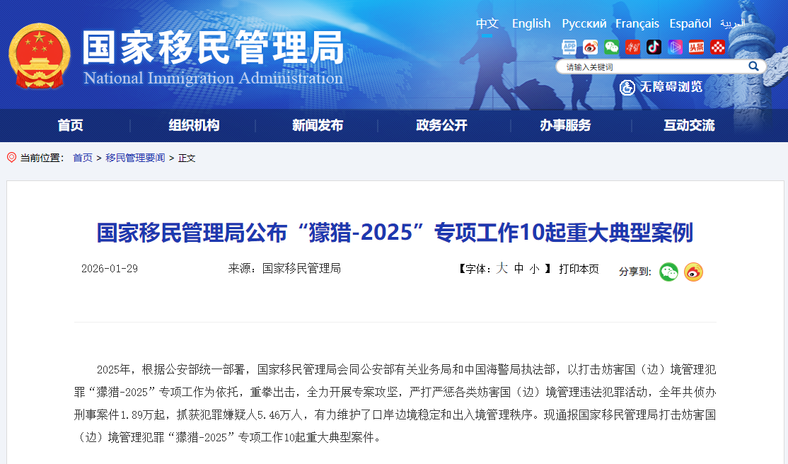 圖源:國家移民管理局網站截圖 據中國央視29日報道,10起重大典型案件當中,“12·26”案由廣西邊檢總站與自治區公安廳聯合偵辦,為境內外“蛇頭”勾結,組織中國公民經陸路及海上偷渡出境從事電詐、賭博等犯罪活動。該案已立刑事案件88起,打掉團夥12個,搗毀中轉窩點23處,斬斷偷渡通道5條,刑事處理200人。 另一起典型案件“3·11”案由雲南邊檢總站與廣東省公安廳聯合偵破,犯罪團夥組織毗鄰國家人員從雲南偷渡入境,並轉運至內地非法務工,甚至充當非法婚介安排“跨國婚姻”。目前該案已刑事打擊177人,行政查處188人,查處非法用工企業3家。 此外,“5·03”案中,江蘇、廣州、珠海多地協作,打掉一個偽造材料騙辦港澳簽註的團夥,凍結涉案資金超500萬元(人民幣,下同);“7·16”案則揭露金某等人招募人員經西南邊境偷渡赴境外從事電信詐騙,已刑事處理82人,凍結資金170餘萬元。 中國國家移民管理局強調,將持續深化國際執法合作,參與全球移民治理,打擊偷渡、證件造假、非法務工等跨境犯罪,同時保障中外人員安全有序流動,維護國家主權、安全與發展利益。(完) 【編輯:彭玉婷】