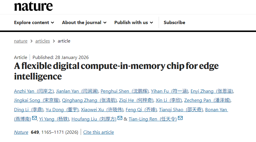 國際頂級期刊《自然》(Nature)網站截圖 在人工智能與物聯網、具身智能深度融合的背景下,對輕量、高效、柔性的智能計算硬件需求日益迫切。傳統基於矽基的剛性芯片難以滿足貼合人體或複雜曲面設備的部署要求,而現有柔性處理器普遍受限於低工作頻率、高能耗和缺乏並行計算能力,難以勝任神經網絡推理等數據密集型任務。 清華大學、北京大學等機構科研人員成功基於國產工藝研製出FLEXI系列全柔性數字型存算一體芯片,突破了柔性電子應用於邊緣高性能人工智能計算的天然瓶頸。該芯片基於低溫多晶矽薄膜晶體管,薄如蟬翼,可隨意彎折,並具備超低功耗、高能效、高魯棒性與低成本等優勢。 據介紹,該芯片還採用了以全數字靜態隨機存取存儲器為核心的“存算一體”架構,相當於把“記憶單元”和“計算單元”合二為一,省去了來回搬運數據的時間和能耗,更加高效。其中,最小版本的FLEXI-1芯片面積僅31.12平方毫米,集成10628個晶體管,可在僅55.94微瓦的超低功耗模式下運行。 研究者之一、北京大學人工智能研究院助理教授燕博南告訴記者,該芯片可承受超過4萬次180度彎曲而性能無衰減,並在長達6個月的長期測試中保持穩定運行,還可支持神經網絡的壓縮與一鍵部署,增強芯片的智能處理效率。單個僅為1千比特容量的柔性芯片就可實現準確率高達99.2%的心律失常檢測,為下一代可穿戴醫療設備、柔性腦機接口以及智能機器人等提供不可或缺的核心計算引擎。(完) 【編輯:彭玉婷】