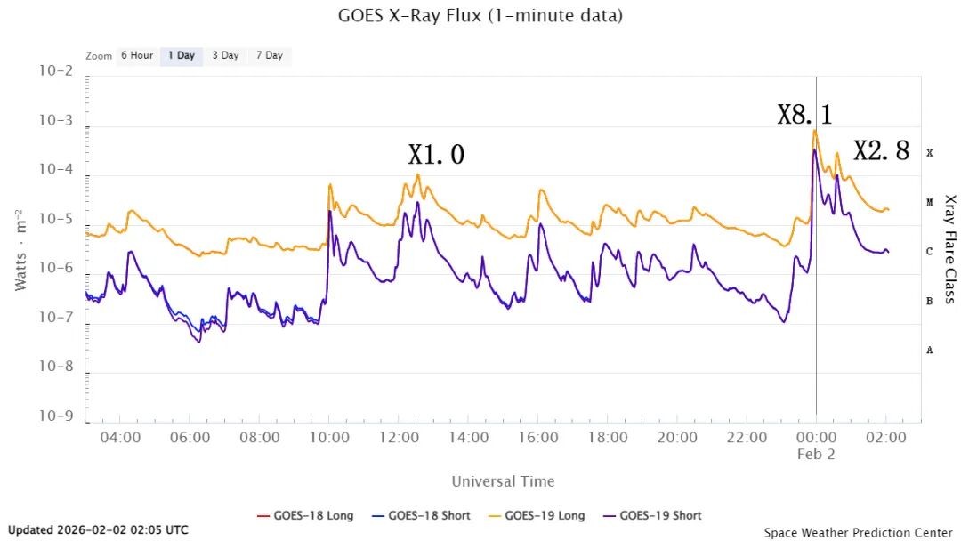 香港中通社2月2日電 中國氣象局國家空間天氣監測預警中心發布消息稱,北京時間2月1日20時至2月2日9時,太陽活動區14366連續3次爆發X級耀斑,其中,2日早8時左右爆發的耀斑達到X8.1級,是今年太陽出現的最強耀斑過程,同時也是2024年10月以來最強耀斑過程。