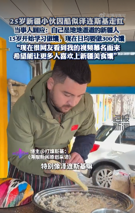 (視頻截圖) 他表示,自己15歲學習打饢技藝,經營饢店多年,是地地道道的新疆人。他坦言希望藉機宣傳新疆傳統美食:"很多人說我像澤連斯基,正好通過社交平台推廣新疆饢。" 他走紅後店鋪日收入翻倍,"總統饢"成為打卡焦點,吸引大量中國網友慕名前往。 網友結合其職業與外貌造詞“饢連斯基”“打饢司機”,並調侃“停火了饢就烤不好”。