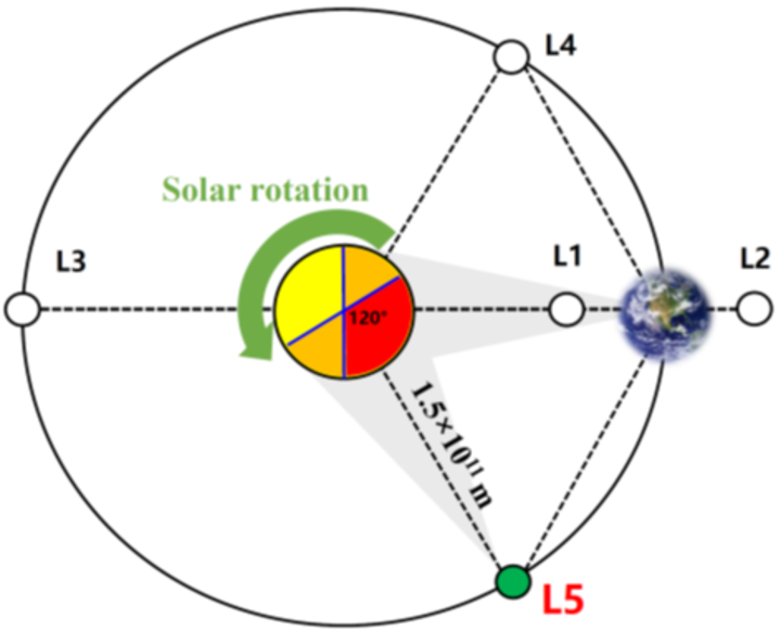 “羲和二號”計劃前往的日地L5點位置示意圖。圖源:南京大學 該探測器預計發射質量約1600千克,基於“太空高分”平台設計,具備超精超穩對日指向能力,將攜帶光譜磁場望遠鏡、極紫外成像儀、日冕日球層成像包、高能太陽望遠鏡、原位測量包等有效載荷,完成太陽磁場、日冕、日球層空間的高分辨率遙感探測,以及太陽風、行星際磁場、空間粒子的高精度局地探測。 太陽和地球存在5處引力平衡點,其中L1、L2、L3位於日地連線上,L4、L5則處於地球環繞太陽運行的軌道上,分別與太陽、地球構成邊長約1.5億公里的等邊三角形。若將地球公轉方向視為“前方”,那L5點就位於地球的“後方”,位於該點的人造探測器無需消耗太多燃料就可以穩定長期駐留,因此“羲和二號”的設計壽命將長達7年。 截至目前,人類已發射太陽探測器70餘顆,絕大多數分布在日地連線上,少數環繞太陽運行,尚未有探測器在日地L5點駐留。2021年中國成功發射“羲和號”衛星,正式邁入空間“探日時代”。 據悉,“羲和二號”探測器成功發射後,將經過約800天的轉移飛行,抵達日地L5點開展太陽探測。它將給人類提供一個全新的“旁觀者”視角,對太陽磁場和太陽活動實現精細測量,建立完整的太陽爆發三維物理模型,並增強中國空間天氣預警預報能力。(完) 【編輯:彭玉婷】