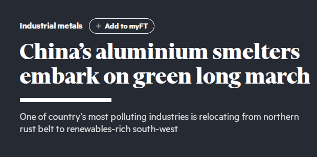 《金融時報》2月8日報道截圖,標題為“中國鋁冶煉廠開啟綠色長征”