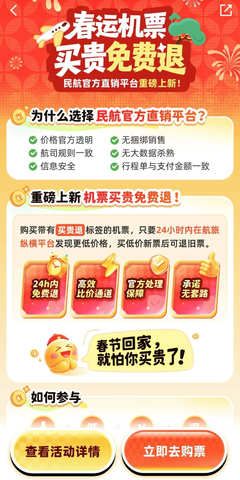 圖源:“航旅縱橫”APP截圖 綜合11日消息,根據規則,旅客在航旅縱橫App購買帶有“買貴退”標籤的機票後,若在出票24小時內發現同一航班出現更低價格,可重新購買便宜機票,並通過平台專屬頁面申請退還原票款。 該服務目前已覆蓋中國國際航空、南方航空、東方航空三大航司,後續將逐步擴展至更多航空公司。購票頁面設有明確標識和條款說明,平台建議用戶仔細閱讀相關細則。 相較於部分第三方平台存在的價格不透明、捆綁銷售等問題,航旅縱橫作為民航官方直銷平台,堅持票價公開、無大數據殺熟、退改規則與航司一致,確保報銷憑證真實有效。有旅客反饋,“買貴退”服務如同“定心丸”,顯著降低了因票價波動帶來的決策焦慮。 今年1月,隨著奧凱航空正式入駐,航旅縱橫已實現對中國境內所有航空公司機票的全面接入,完成民航直銷版圖拼圖。此次“買貴免費退”服務的推出,不僅提升了用戶購票體驗,也標誌著民航官方平台在服務創新與消費者權益保障方面邁出關鍵一步,為行業樹立了規範化、透明化的新標竿。(完) 【編輯:彭玉婷】
