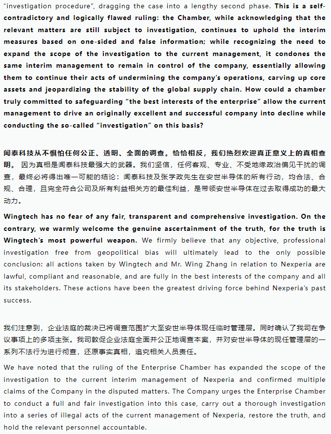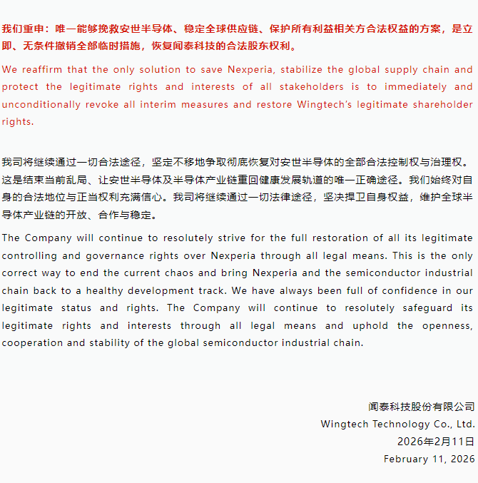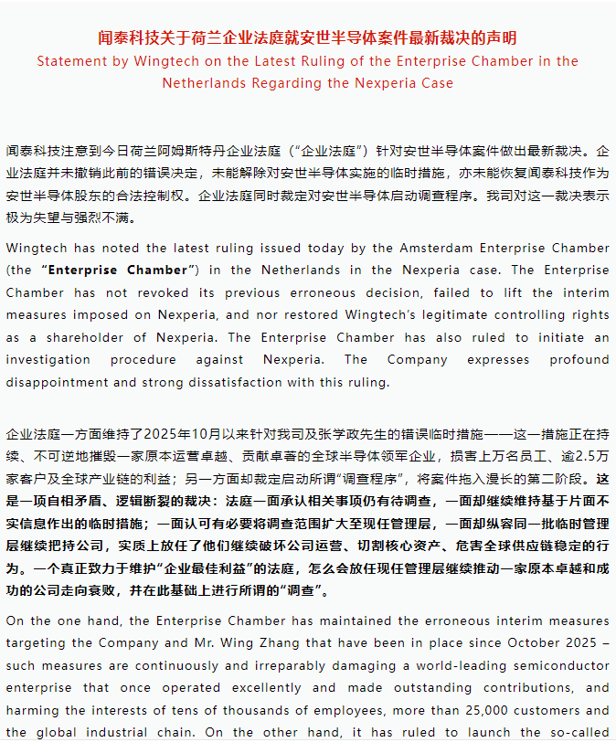聲明。圖源:聞泰科技公眾號 據聞泰科技公眾號消息指,法庭雖決定啟動對安世半導體的正式調查,將調查範圍擴大至現任臨時管理層,卻同時維持自2025年10月以來實施的全部臨時措施,包括限制聞泰科技及其董事長張學政的股東權利與公司治理權。 聞泰科技指出,該裁決邏輯矛盾:一方面承認案件存在重大疑點需深入調查,另一方面卻繼續執行基於片面信息作出的限制性措施,導致安世半導體——這家全球領先的半導體企業持續遭受不可逆損害。公司強調,臨時管理層在缺乏監督下繼續掌控運營,已造成核心資產被切割、客戶流失及供應鏈紊亂,危及上萬名員工與逾2.5萬家客戶的利益。 值得注意的是,法庭此次明確將現任管理層行為納入調查範疇,部分認可聞泰科技的多項主張。聞泰表示歡迎公正透明的調查,堅信真相將證明其所有決策均合法合規,且始終以公司最佳利益為依歸。 聞泰科技重申,唯有立即撤銷所有臨時措施、恢復其合法控制權,才能挽救安世半導體、穩定全球半導體產業鏈。聞泰科技承諾將繼續通過一切法律途徑,堅決捍衛自身權益,推動企業重回健康發展軌道。 去年10月,荷蘭政府援引冷戰時期法律臨時接管安世半導體,法院隨後凍結聞泰股東權利;今年2月11日,荷蘭企業法庭維持該限制,並啟動對安世管理層的正式調查。(完) 【編輯:彭玉婷】