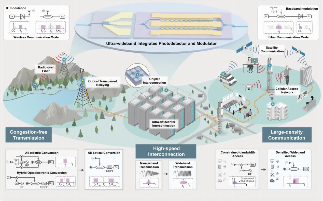 香港新聞網2月19日電 中國科學家在光通信和下一代無線通信(6G)領域突破三項世界紀錄,在全球範圍內率先實現了光纖和無線通信系統間的跨網絡無縫融合。2月18日,該研究成果以《集成光子學賦能超寬帶光纖-無線通信》為題,在線發表於國際頂尖學術期刊《自然》。論文通訊作者、北京大學電子學院副院長王興軍教授表示:“該成果就像是通信領域的『全能戰士』,除實現兼容且超大容量通信外,在能耗、成本、規模化等方面也有卓越的表現。未來可在6G基站、無綫數據中心等場景中廣泛應用。” 據香港文匯報報道,該成果成功突破三項世界紀錄,包括250 GHz以上超大帶寬的光電/電光轉換器件、薄膜鈮酸鋰調製器(TFLN MZM)和磷化銦探測器(InP UTC-PD)帶寬。 光纖通信和無線電通信是兩種不同的通信技術,各自具有獨特的優勢和適用場景。但在當前萬物互聯時代,電信通信網絡中存在兩種通信技術的痛點也愈發突出,它們在信號架構與硬件約束上存在帶寬鴻溝,阻礙了統一的系統設計,導致兩者難以在同一套基礎設施上實現高速且兼容的端到端傳輸。