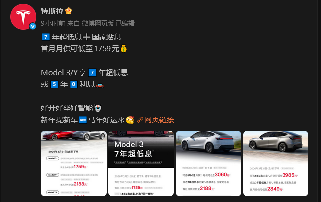 特斯拉中國26日宣佈推出新一輪購車金融優惠政策 綜合報道,此舉被業內視為“變相降價”,旨在刺激終端需求。具體來看,Model 3首付7.99萬元(人民幣,下同)起,首月月供低至1759元,附贈8000元保險補貼;Model Y與Model Y L首付同為7.99萬及9.99萬元起,月供分別低至2188元與2849元。 這已是特斯拉中國今年第二次推出類似促銷。早在1月6日,公司已實施過一輪7年低息及部分車型零息政策,活動截止至1月31日。