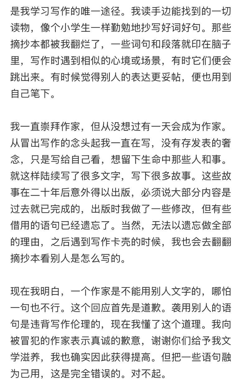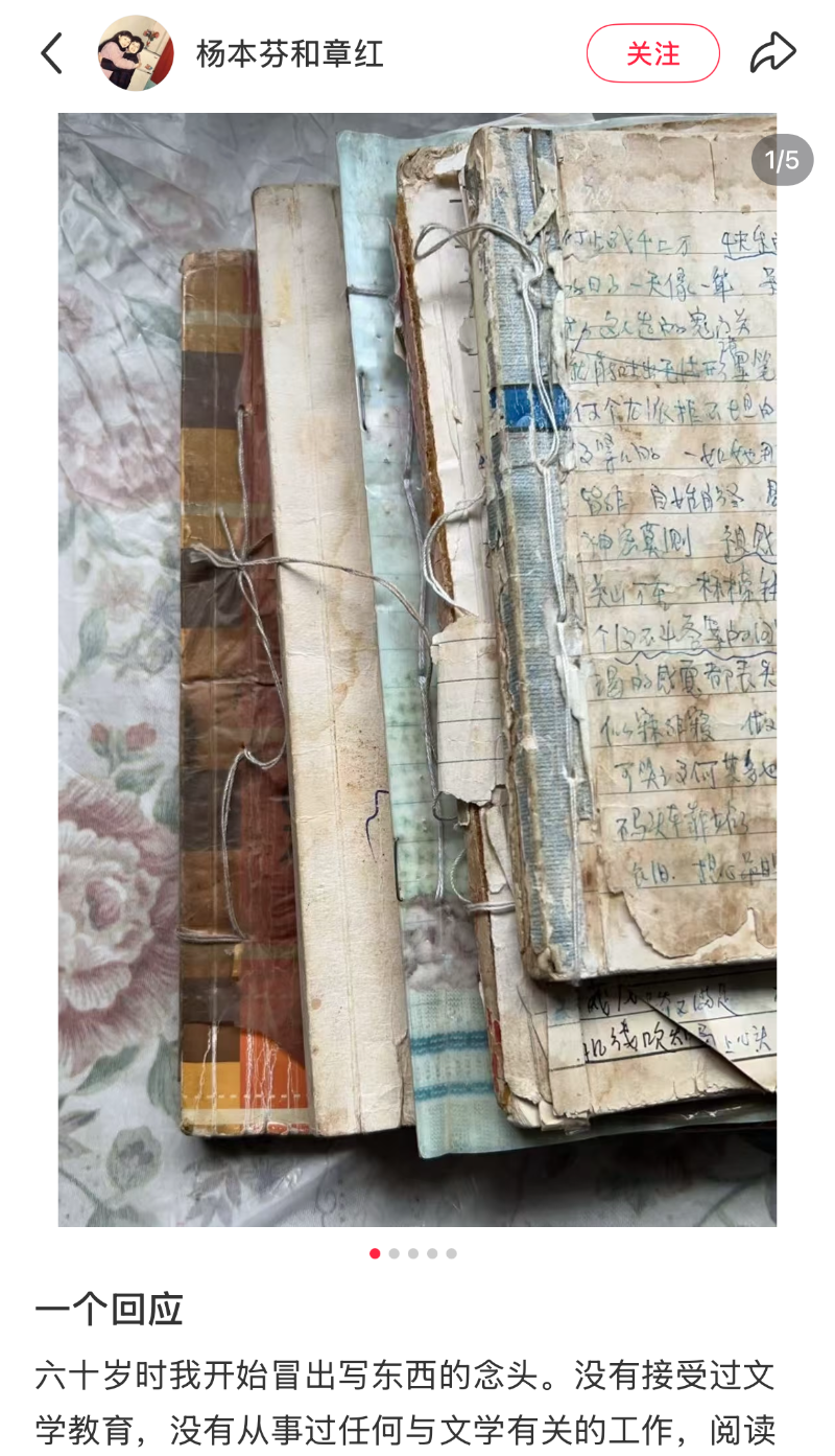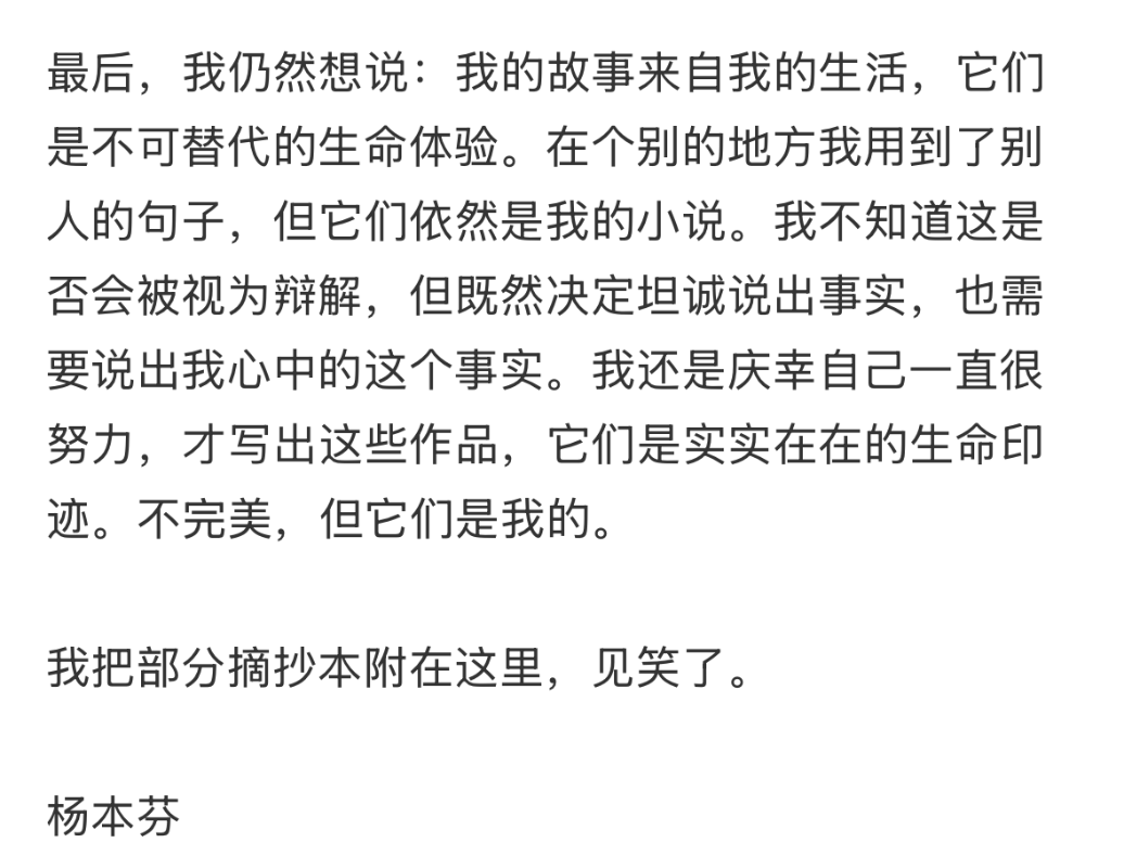 楊本芬在其社交賬號上發文回應 楊本芬坦言:“現在我明白,一個作家是不能用別人文字的,哪怕一句也不行。”她表示,這種行為違背寫作倫理,深感懊悔,並附上個人摘抄本照片以證學習過程。同時,她仍堅持作品核心源於真實生命體驗,“故事來自我的生活,它們是不可替代的生命印跡”。 楊本芬在長文中解釋,自己60歲才開始寫作,未受過專業文學訓練,長期通過大量閱讀和手抄好詞好句自學,“有些句子印在腦子裡,寫作時便不自覺用了出來”。她強調,早期寫作僅為記錄家族記憶,並無發表意圖,部分借用語句在多年後出版修改時已遺忘出處。 近日,網友及知名“鑒抄”博主“抒情的森林”發布多組對比圖,指出楊本芬作品中存在與余華《在細雨中呼喊》、王朔《我是你爸爸》、霍達《穆斯林的葬禮》乃至約翰·格里森姆《超級說客》等書高度相似的段落,部分僅做詞語替換,涉及句式、意象與細節描寫等多個層面。 楊本芬2020年以80歲高齡憑《秋園》一書走紅,被譽為“女版《活著》”,豆瓣評分高達9.0,銷量超30萬冊,斬獲十餘項文學獎項。其“廚房寫作”的質樸風格曾打動無數讀者。此次風波雖未否定其人生敘事的真實性,卻引發關於非虛構寫作邊界與文本原創性的廣泛討論。(完) 【編輯:彭玉婷】