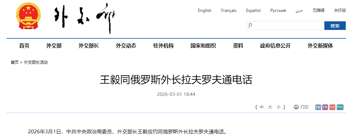 中國外交部網站截圖 “立即停止軍事行動,防止世界倒退回叢林法則”。北京時間3月1日,中共中央政治局委員、外交部長王毅在同俄羅斯外長拉夫羅夫的通話中,對美伊衝突升級作出明確表態。這並非中方首次發聲。早在2月28日衝突爆發當天,中國外交部發言人便表示“高度關切”,呼籲尊重伊朗主權,立即停止軍事行動,恢復對話談判。 “中方的立場本質是反對外力過度介入使局勢複雜化,也反對利用衝突在國際上製造新的分裂和事端。”對於中國一直以來在巴以衝突、伊朗核問題等中東熱點上的基本態度,香港大學當代中國與世界研究中心高級研究助理張馳近日接受香港中通社採訪如是說道。他指出,這種立場與某些國家在巴以衝突中篡改聯合國授權機制、將和平委員會泛化的做法形成鮮明對比。在烏克蘭危機中,中方一貫“勸和促談”“政治解決”的定位也體現了這一原則。 對於此次美以襲擊伊朗,從中國外交部發言人的初步表態,到王毅與俄外長的通話,核心立場可歸納為:立即停火止戰,防止戰火蔓延和外溢;重回對話談判,各方應敦促當事方重返政治解決軌道;反對單邊行徑,國際社會應共同反對世界倒退回“叢林法則”。在與俄外長的通話中,王毅還特別指出,“公然擊殺一個主權國家領導人、鼓動政權更迭不可接受”,這些行為違反了國際法和國際關係基本準則。