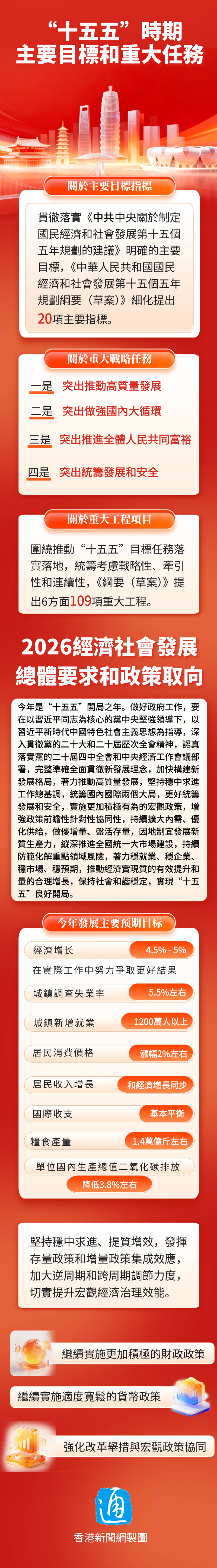 香港新聞網3月5日電  3月5日上午9時,十四屆全國人大四次會議在北京人民大會堂舉行開幕會,國務院總理李強作政府工作報告。一圖速覽“十五五”時期主要目標和重大任務、2026年經濟社會發展總體要求和政策取向。
