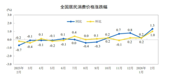 中國開年物價數據透視:消費熱持續,生產端回暖香港新聞網3月9日電 中國國家統計局於3月9日發布2026年2月居民消費價格指數(CPI)及工業生產者出廠價格指數(PPI)數據。這份開年首份物價“成績單”顯示,受傳統節日因素與宏觀政策效應疊加影響,物價運行呈現消費端回暖、生產端築底的態勢,對居民生活成本及經濟預期具有啟示意義。 中國國家統計局數據顯示,今年2月份,中國CPI同比上漲1.3%,創近三年來單月新高;環比則由上月0.2%擴大至1.0%,為近年少見的較大漲幅。這反映,長達數日的春節假期有效激發了居民消費潛力,特別是服務性需求集中釋放。