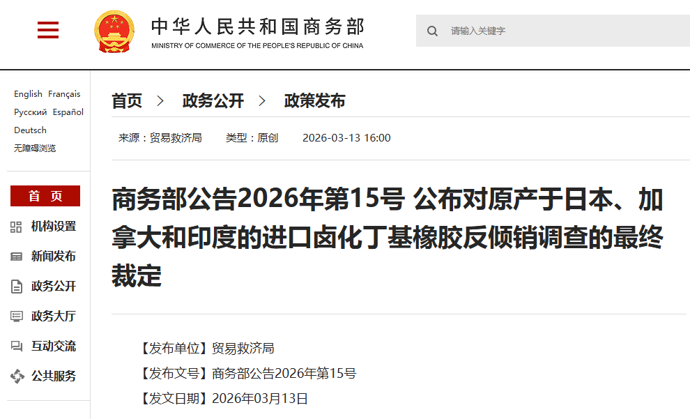 (中國商務部網站截圖) 據介紹,2024年9月14日,中國商務部(以下稱調查機關)決定對原產於日本、加拿大和印度的進口鹵化丁基橡膠進行反傾銷立案調查。 2025年8月12日,調查機關發布初裁公告,初步認定原產於日本和加拿大的進口鹵化丁基橡膠存在傾銷,中國國內鹵化丁基橡膠產業受到實質損害,並且傾銷與實質損害之間存在因果關係;終止對原產於印度的進口鹵化丁基橡膠的反傾銷調查。 初步裁定後,調查機關對傾銷和傾銷幅度、損害及損害程度以及傾銷與損害之間的因果關係進行了繼續調查。調查機關最終裁定,原產於日本和加拿大的進口鹵化丁基橡膠存在傾銷,中國國內鹵化丁基橡膠產業受到實質損害,而且傾銷與實質損害之間存在因果關係。 據公開資料,鹵化丁基橡膠是丁基橡膠與鹵化劑反應的產物,是普通丁基橡膠的改良品。主要用於無內胎的氣密層、耐熱內胎、耐熱軟管和輸送帶、藥用瓶塞、防震墊、粘合劑和密封材料等。(完) 【編輯:淩玉輝】