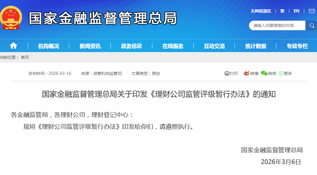 香港中通社3月16日電 中國國家金融監管總局近日發布並施行《理財公司監管評級暫行辦法》(以下簡稱《辦法》),對理財公司監管評級的總體要求、評級要素、基本程序和分類監管等作出規定。