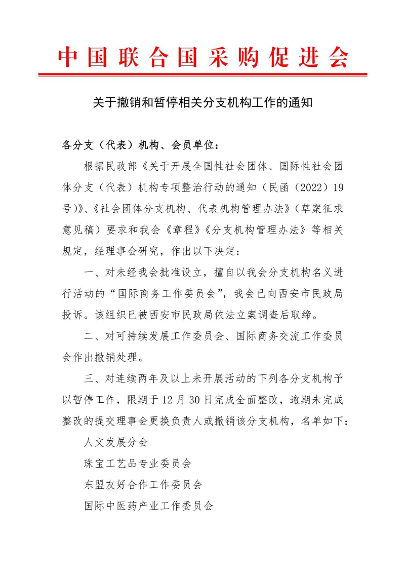 來源:中國聯合國採購促進會 綜合18日消息,通知明確,未經批准、擅自以促進會名義活動的“國際商務工作委員會”已向西安市民政局舉報,並由民政部門立案調查後予以取締。同時,可持續發展工作委員會與國際商務交流工作委員會因存在管理問題亦被正式撤銷。 此外,人文發展分會、珠寶工藝品專業委員會、東盟友好合作工作委員會等六個分支機構,因連續兩年以上未開展實質性活動,被暫停工作,須於今年12月30日前完成全面整改;逾期未達標者,將面臨負責人更換或直接撤銷處理。 據悉,相關通知緊隨該會3月12日發布的嚴正聲明,劍指社會上以“保證拿到聯合國訂單”為名的詐騙行為。據聲明中強調,聯合國採購嚴格遵循公開、公平、透明原則,絕無“內部保障”或“承諾中標”可能,重申從未、也絕不會向任何企業作出此類承諾。所有聲稱可通過該會“穩拿訂單”的說法均為虛假信息。 中國聯合國採購促進會成立於2006年,是經民政部註冊、商務部主管的全國性社團,也是內地唯一官方對接聯合國採購事務的商協會。近期,該會頻繁接到企業反映,有不法分子冒用其名義,謊稱掌握“內部渠道”可確保中標聯合國採購項目,誘騙企業支付高額中介費。(完) 【編輯:彭玉婷】