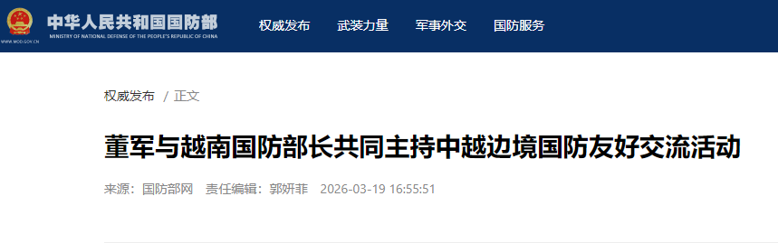 香港中通社3月19日電 中國國防部長董軍18日至19日與越南國防部長潘文江共同主持中越第十次邊境國防友好交流活動,並舉行會談。