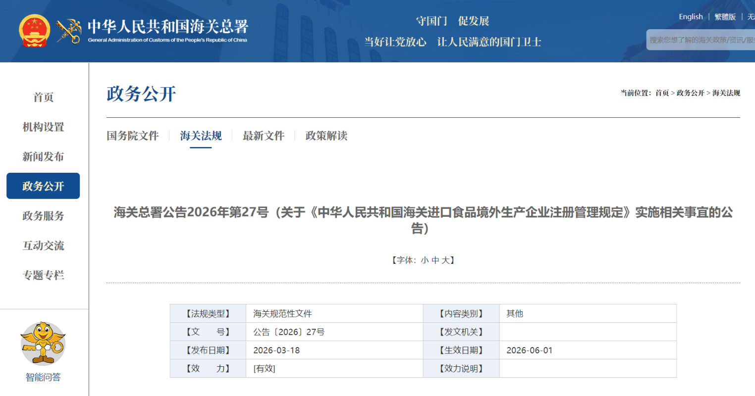 圖源:中國海關總署網站截圖 中國海關總署進出口食品安全局局長李勁松3月19日在海關總署發布會上介紹,現行《註冊管理規定》自2022年1月1日起正式實施,四年多來,全球已有178個國家(地區)的9.6萬餘家食品企業在華註冊,在合規供應商的持續增加助力下,輸華食品類別從南非的烘焙咖啡豆到烏茲別克斯坦的乾堅果,從挪威的三文魚到新西蘭的冷凍水果,多樣化水平不斷提高,同時帶動中國進口食品貿易總額穩步增長,從2021年的1.25萬億元人民幣增長至2025年的1.32萬億元人民幣。 他表示,隨著中國對外開放水平不斷提高,境外食品生產企業註冊申請數量快速增長,有必要進一步完善註冊管理制度。因此,中國海關總署在鞏固已有進口註冊制度改革成果的基礎上,基於國際共治、風險管理、全程控制、嚴謹務實的原則,對現行《註冊管理規定》進行了修訂。主要呈現四個特點:一是公開透明;二是突出安全;三是更加便利;四是共商共治。 他特別說明,為細化明確《註冊管理規定》相關要求,回應各方關切,保證註冊規定制定實施全過程公開、透明、可預期,3月18日中國海關總署發布《註冊管理規定》配套實施公告,基於風險評估結果,公布《需官方推薦註冊的進口食品目錄》,不予自動延續註冊食品清單和實施註冊管理的境外貯存企業範圍等目錄清單,進一步細化進口食品涉註冊信息申報要求,並更新註冊辦理和常用註冊信息查詢網址,幫助進口註冊相關方更好地了解註冊要求,辦理註冊申請。(完) 【編輯:彭玉婷】