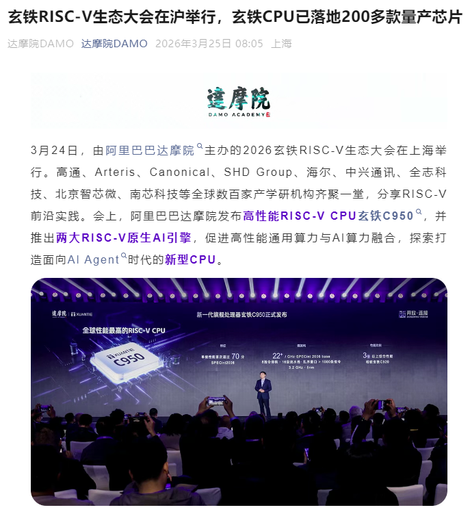 圖源:達摩院公眾號截圖 據介紹,玄鐵C950利用RISC-V開源開放特性,搭載自研AI加速引擎,首次原生支持Qwen3、DeepSeek V3等千億參數大模型,標誌RISC-V正式邁入高端AI計算領域。 為促進生態發展,達摩院推出Flex可擴展平台,支持客戶深度定製CPU。2024年已有35家客戶完成38項底層改動,超半數聚焦AI加速與可靠性。目前,玄鐵系列已應用於200多款量產芯片、近千款終端,涵蓋服務器、機器人、新能源汽車等領域。 當日的發布會上披露,RISC-V全球芯片出貨佔比於去年底已突破25%,逐步打破x86與Arm雙寡頭格局。阿里正通過“無劍聯盟”聯合Canonical、天翼雲、國芯科技等夥伴,共建操作系統、AI適配與認證體系,並攜手中科院等機構研發下一代香山CPU。 達摩院首席科學家孟建熠強調,高性能標竿產品是RISC-V參與AI時代競爭的關鍵。隨著C950量產及“平頭哥”籌備獨立上市,阿里巴巴正以硬件支撐其全棧AI戰略加速落地。(完) 【編輯:彭玉婷】